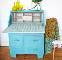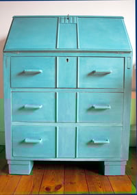 This stunning up-cycled wooden writing bureau has been hand painted and stencilled using Annie Sloan Chalk Paint™. The edges have been gently sanded and It has been finished with a couple of coats of clear wax.